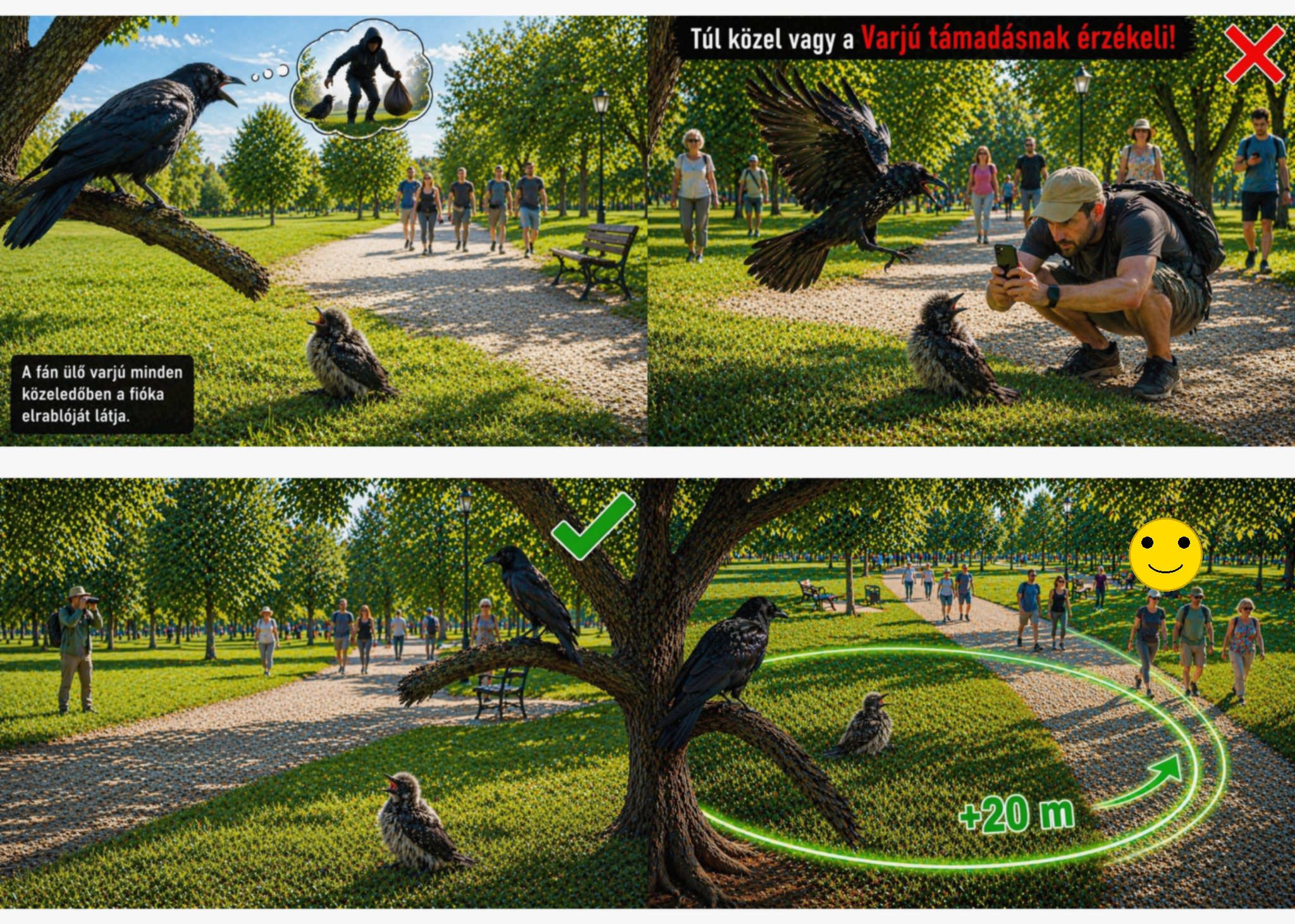 Nézd meg jól a fenti ábrát. Amit te „cuki fiókának” látsz a járda szélén, akiről kell egy közeli fotó az Instára, azt a szülő a faágról „veszélyben lévő gyereknek” látja. Számára te nem egy békés járókelő vagy, hanem egy hatalmas, fenyegető ragadozó, aki épp a gyereke fölé hajol.