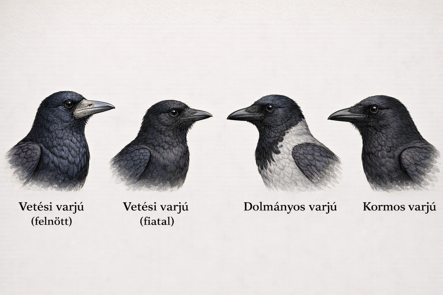 Fejforma és csőr: A Dolmányos varjú csőre vaskosabb, feje robusztusabb. Ezzel szemben a kifejlett Vetési varjú csőrtöve szarus és világos.